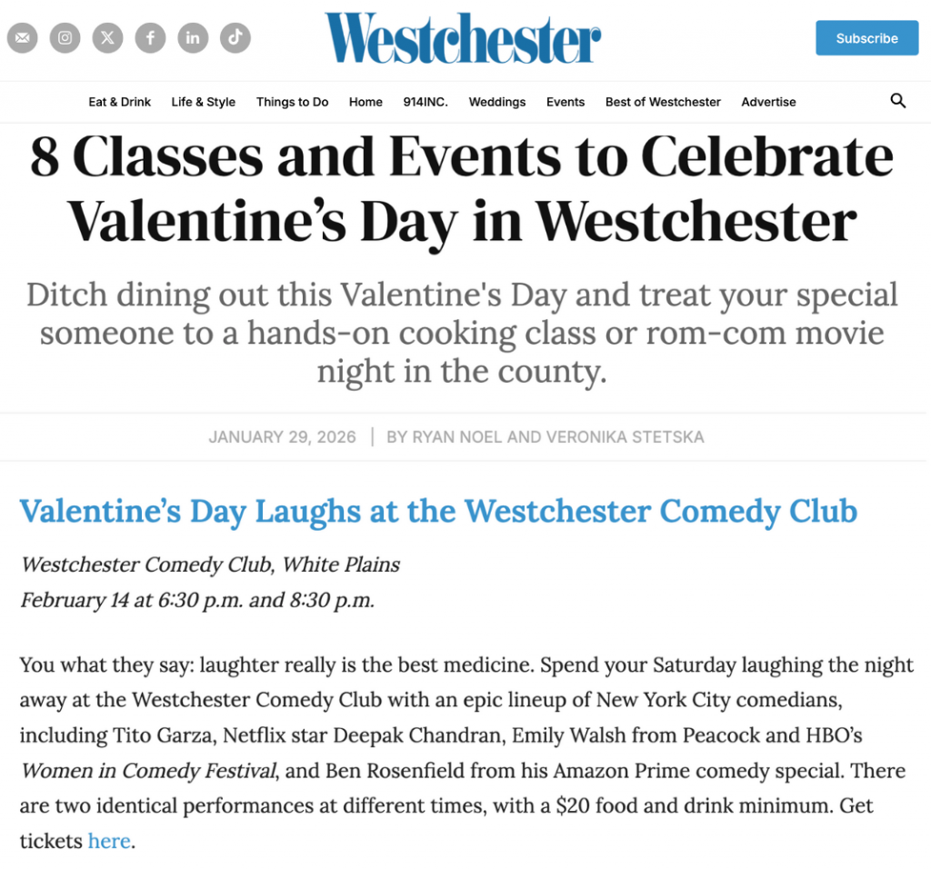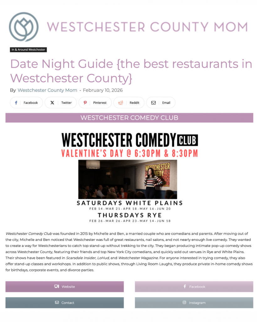 We’ve consistently sold out shows at Rye Comedy Club (inside The Rye Grill & Bar) and White Plains (inside Tre Angelina) and are always looking to expand.